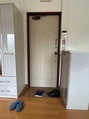 玄関からお部屋が丸見えだったので、収納を玄関脇に造り付で設置し、キッチンや水回りが見えるのを防ぐため、ロールスクリーンを設置することをご提案させていただきました。