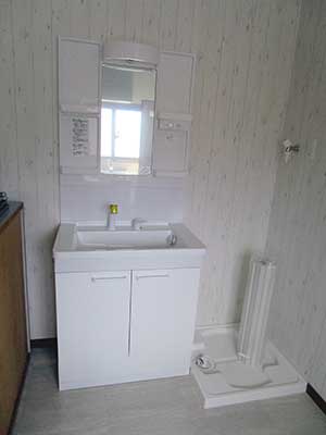 お風呂は高齢者にも安心のユニットバス、洗面は収納が充実したものを、キッチンについては部屋が広く使える壁付けのIライン型システムキッチン(吊戸棚付き)をご提案させていただきました。